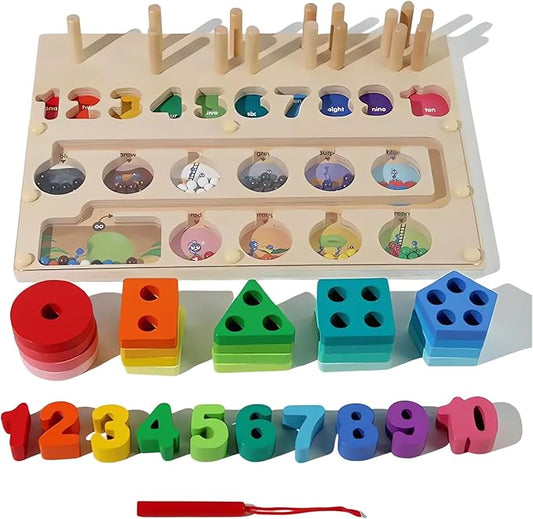 3-in-1 Magnetic Wooden Maze, Montessori Toys, Stacking Building Blocks Shape Sorter Number Board, Color Matching Educational Learning Toys for Kids, Toddler Gift, Toys for Boys Girls 3 4 5 Years Old