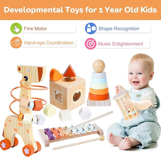 Wooden Montessori Toys Set for Toddlers,Wooden Toy Set for Babies Educational Object Permanence Box,Xylophone(Glockenspiel),Stacking,Rattle Birthday Gift for Boys Girls Ages 1 2 3 4 5