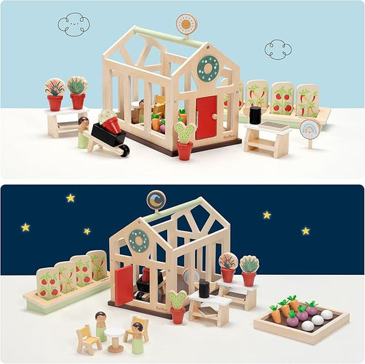 PairPear Dollhouse Furnitures Flower Garden Toy Greenhouse Playset,Toddlers Wooden Toys Dollhouse Garden Toys,Pretend Play Food Set for Girls Boys 3 Years and Up