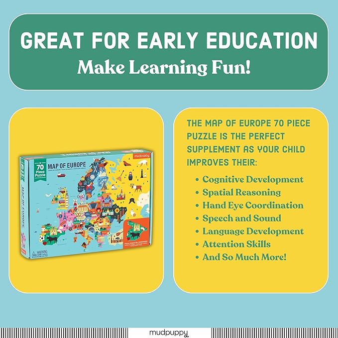 - GEOGRAPHY PUZZLE – The Map Of Europe Puzzle from Mudpuppy is a 70 Piece Double Sided Shaped Jigsaw Puzzle that features European countries by name, geographical shape and location from the colorful and whimsical illustrations of the map puzzle.