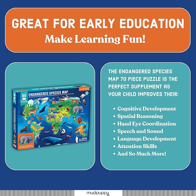 - ENDANGERED SPECIES PUZZLE – The Endangered Species Map Puzzle from Mudpuppy is an 80 Piece Shaped Jigsaw Puzzle that features all kinds of animals that are in danger of becoming extinct on our planet. The puzzle is a great activity for kids to do alone or for families to join in and solve the puzzle together, all while creating a positive bonding experience for young ones. The storage box shows the completed puzzle and is an ideal place to keep pieces safe and free from damage.