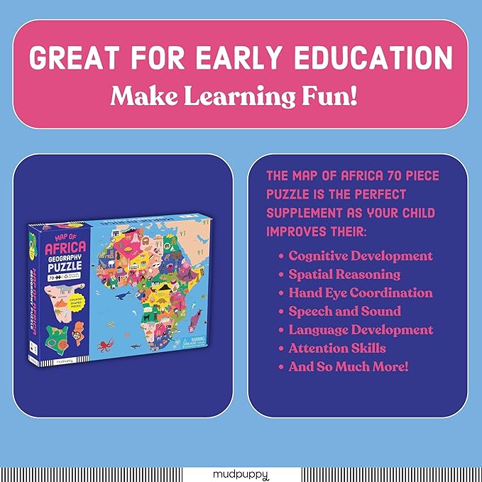 - GEOGRAPHY PUZZLE – The Map Of Africa Puzzle from Mudpuppy is a 70 Piece Shaped Jigsaw Puzzle that features African countries by name, geographical shape and location from the colorful and whimsical illustrations of the map puzzle along with country shaped puzzle pieces. The puzzle is a great activity for kids to do alone or for families to join in and solve the puzzle together, all while creating a positive bonding experience for young ones. The puzzle includes an icon key of famous landmarks along with the full puzzle image for reference.