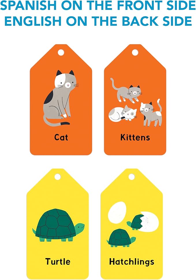- FLASHCARDS - The flashcards will help young ones to learn basic Spanish words and link different objects with each image! Keep the cards on the ring to help improve visual recall or remove them so children can sort for a hands on Montessori approach.