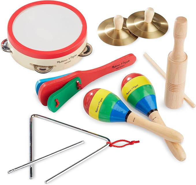 - 10-piece musical instrument set to get kids moving, grooving, and feeling the beat