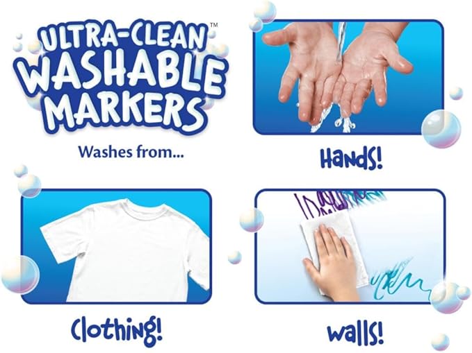 • WASHABLE MARKERS: Crayola Ultra-Clean Markers wash easily from skin, painted walls, and most clothing.
