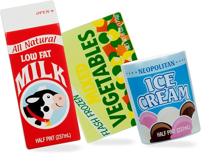 - 9-piece set includes waffles, milk, ice cream, swiss cheese, butter, frozen vegetables, orange juice, yogurt, lunch meat