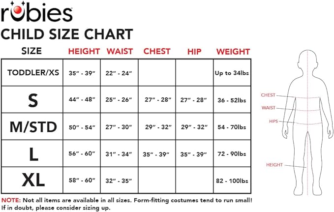 - SIZE GUIDE: Costumes fit differently than standard apparel, so please consult the Rubies Child size chart in the images, reviews, and Q&A for the best fit.