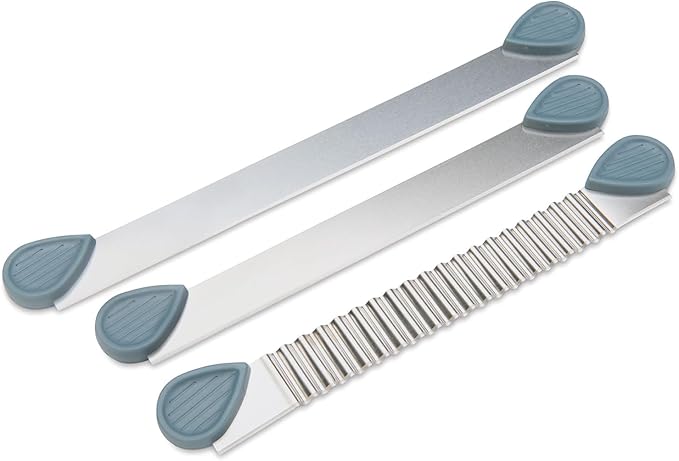 - Set includes three different types of blades: Long, rigid blade for straight cuts or edges. Flexible blade for curved cuts and edging. Wave blade for decorative cuts and edging.
