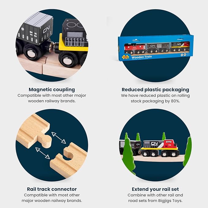 - WOODEN CN TRAIN - Based on Canadas largest railway, the CN Train comes with 1 train engine, 1 caboose and 1 goods wagon with magnetic couplings; includes 2 track pieces to extend your tots train set