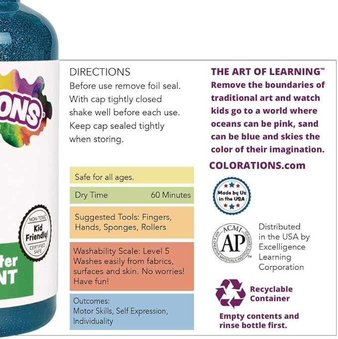 - VIBRANT GLITTERY COLORS: 8 Bold Colors include; blue, green, orange, red, turquoise, violet, white and yellow. Introduces young children to painting using their fingers. Can also be used with brushes & sponges. Made in USA.