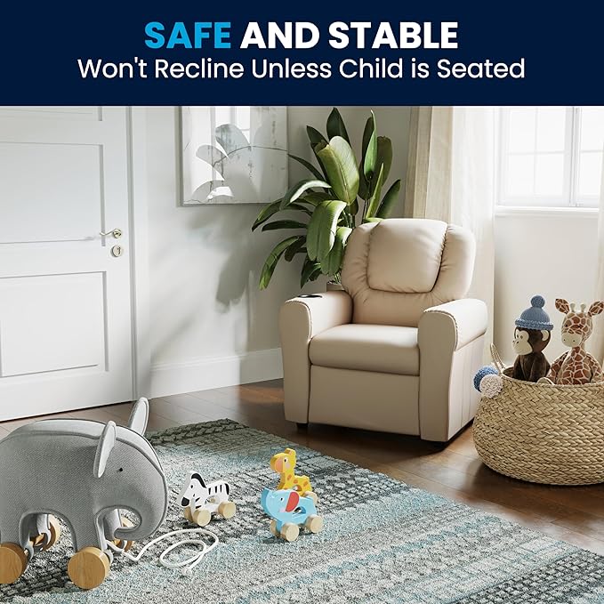 Flash Furniture Vana Vinyl Kids Recliner with Cup Holder, Headrest, and Safety Recline, Contemporary Reclining Chair for Kids, Supports up to 90 lbs., Beige
