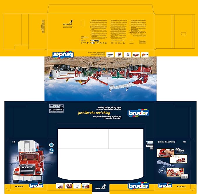 - Includes a Mack fire truck and removable light and sound module (item 02801) with 4 functional buttons for engine noise, police yelp, police siren, fire siren