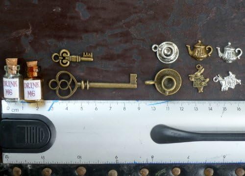- 10pcs mix of beautiful vintage victorian style charms delicate glass bottle charm pendants, broze keys, tea pots - cups, double sided rabbits in silver and bronze tones