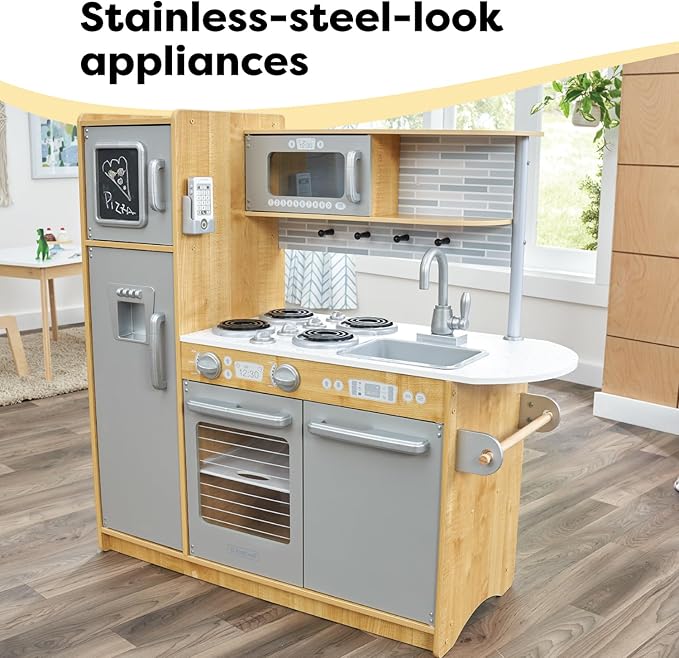KidKraft Uptown Natural Wooden Play Kitchen with Play Phone, Chalkboard & Towel Rack, Gift for Ages 3+