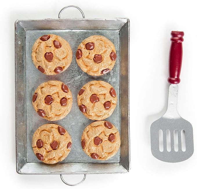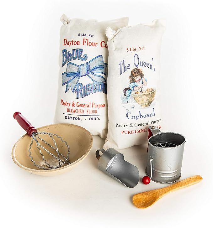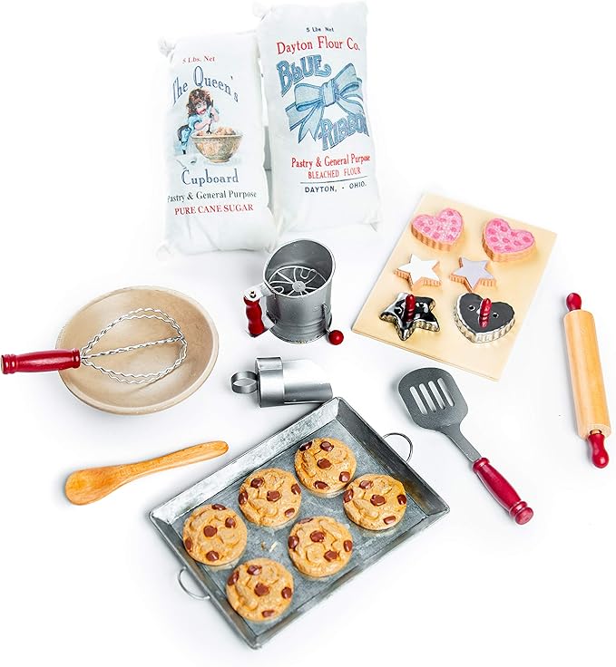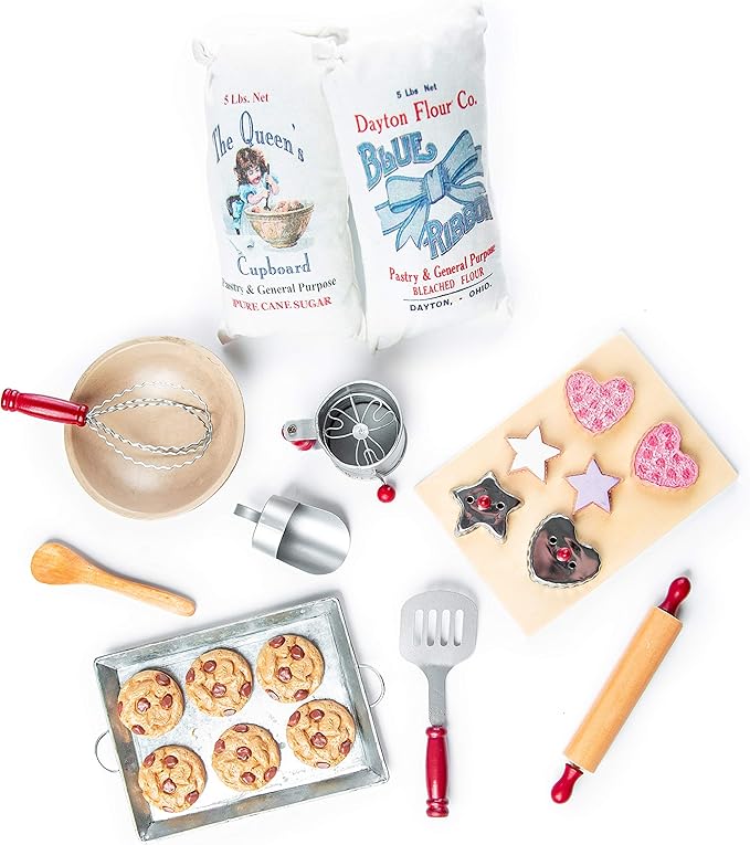 - 23 piece set includes a wooden bowl, whisk, wooden spoon, baking pan, spatula, sifter, tin scoop, rolling pin, 2 cookie cutters, bread board, a sack of flour and sugar, 4 sugar cookies, and 6 chocolate chip cookies