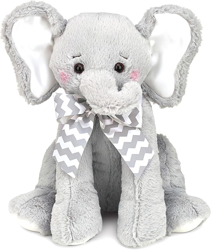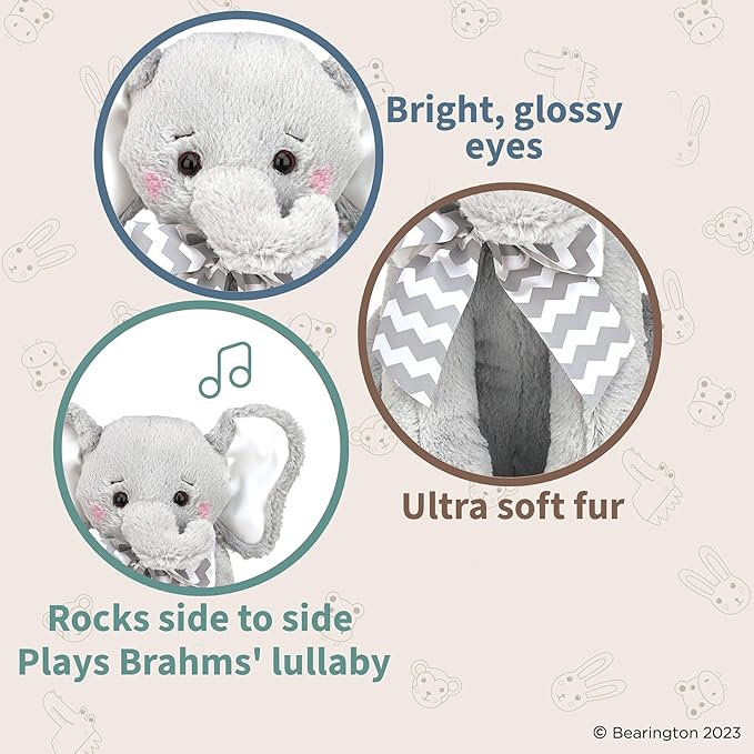 - BABY’S FAVORITE TOY: Enchanting plush grey elephant musical toy for baby rocks side to side and plays two songs sequentially, Brahms' Lullaby and Rock-A-Bye Baby, 13 inches tall