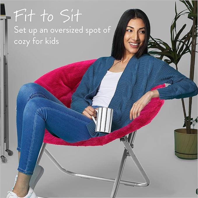 - DESIGN: Settle into a seat that loves you back and is designed to fit your body. A saucer chair designed in a gorgeous pink color that will suit any room décor. Featuring a silver sturdy metal frame to compliment its look. Add additional seating to living rooms, bedrooms, rec rooms or any room with this saucer chair. Designed in a simple bold color that will add a pop of color to any room you decide to put it in. Add a fun and cozy touch to any room you desire with this super soft faux fur saucer chair!