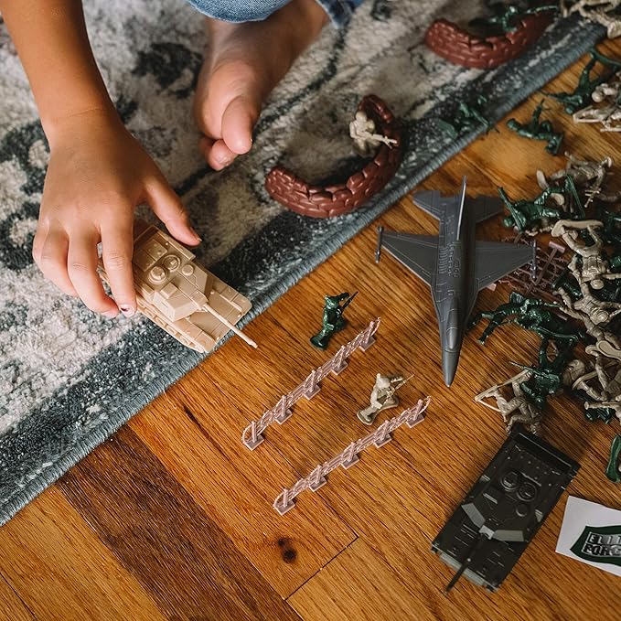 - 100 PIECES: Green army men, tan army men, tanks, airplanes and more in a variety of different sizes and poses are included to help promote imaginative play and fun story telling. The playset also includes fencing, flags and barriers to help bring your story to life.