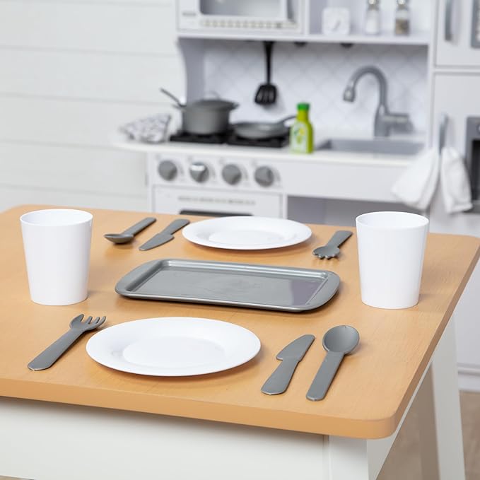 • Includes durable plastic pretend play pot with lid, pan, cookie sheet, spatula, serving spoon, place settings for two (plates, mugs, forks, knives, spoons), and a timer