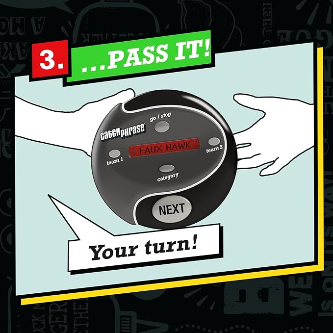 - GRAB IT, GUESS IT, PASS IT: It's classic Catch Phrase gameplay as players try to get their team to guess a word or phrase by giving clues. Guess correctly and pass to the other team before time's up