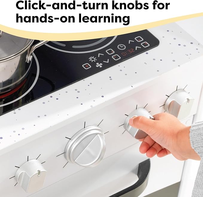 • HANDS-ON PLAY: There's tons to do in this play kitchen. Kids can turn the clickable knobs, pretend push buttons on the microwave, open doors or talk on the cordless play phone.