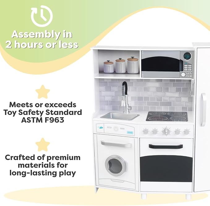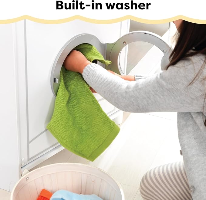 • LOADS OF FUN: Wooden play kitchen also boasts a washer with circular door that really opens so kids can do laundry while cooking dinner.