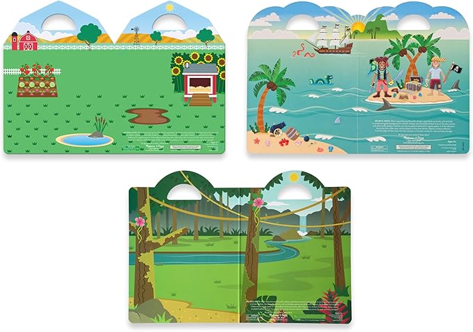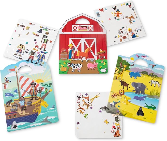 - Create stories and fill scenes again and again with 3 themed reusable puffy sticker play sets (Pirate, Safari, and Farm)