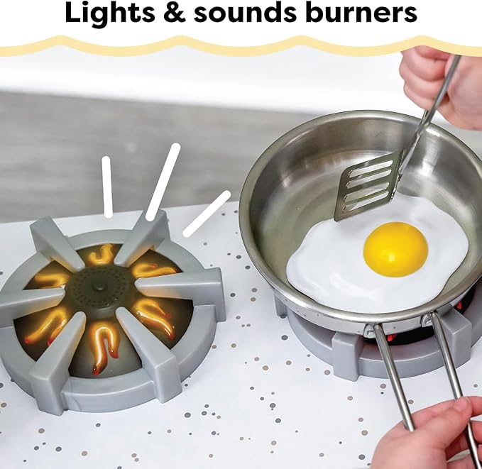 • LIGHTS and SOUNDS: The burners light up and make cooking sounds; water dispenser also lights up and makes realistic sounds when pressed.
