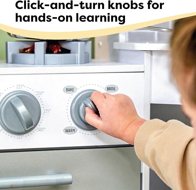• SO DETAILED: Kids will find plenty of hands-on learning with buttons to press, knobs to turn and handles to pull. And, with homey touches like fabric curtains, a wall phone and lots of storage, this wooden kitchen is almost just like the real thing.
