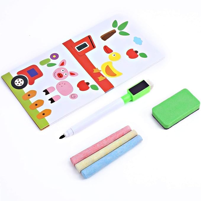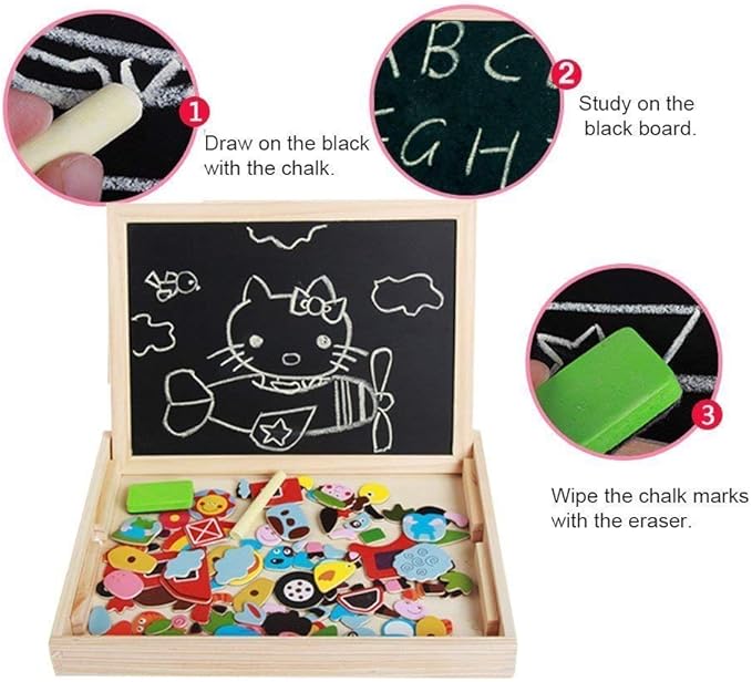 - Two sides: On the white magnetic side, children can play puzzle game with the 100 jigsaw puzzles and draw with the marker pen. On the black board, kids can draw with the supplied chalks