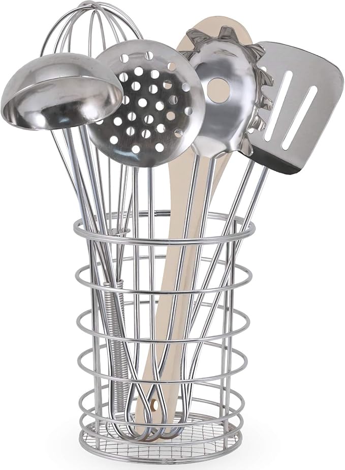 - 7-piece set includes: whisk, ladle, spatula, slotted spoon, spaghetti server, wooden spoon, and holder