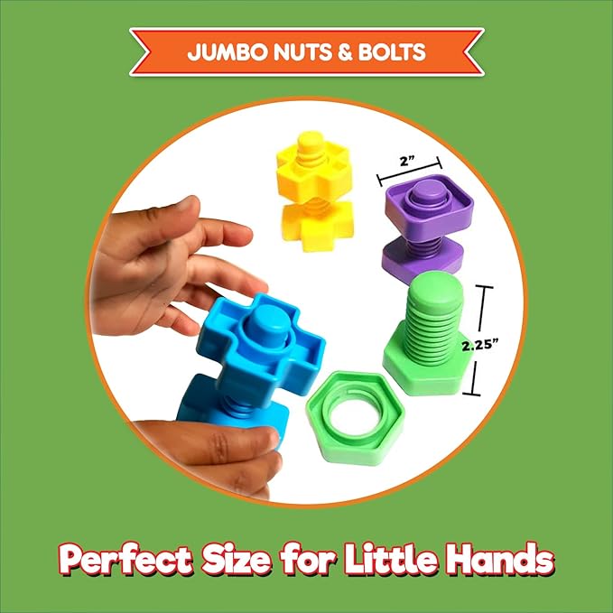 - WHAT YOU WILL LEARN | The jumbo twisting toys are designed to stimulate learning. There are so many things to learn with our jumbo nuts and bolts, including: fine motor skills, colors, shapes, stacking, sorting, matching, patterns, counting, math, same & different, independent play, cooperative play, strengthen hand & arm muscles, listen & follow direction, clean up after play.