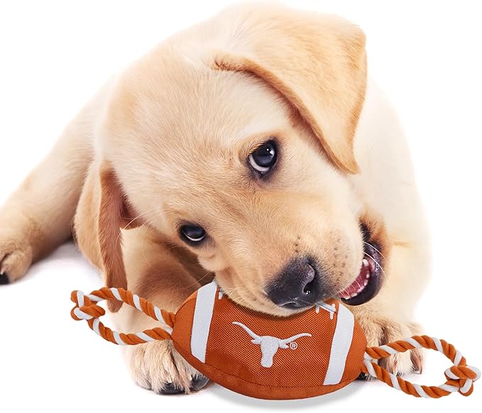 Pets First NCAA Texas Longhorns Football Dog Toy, Tough Quality Nylon Materials, Strong Pull Ropes, Inner Squeaker, Collegiate Team Color, 1 Count (Pack of 1)