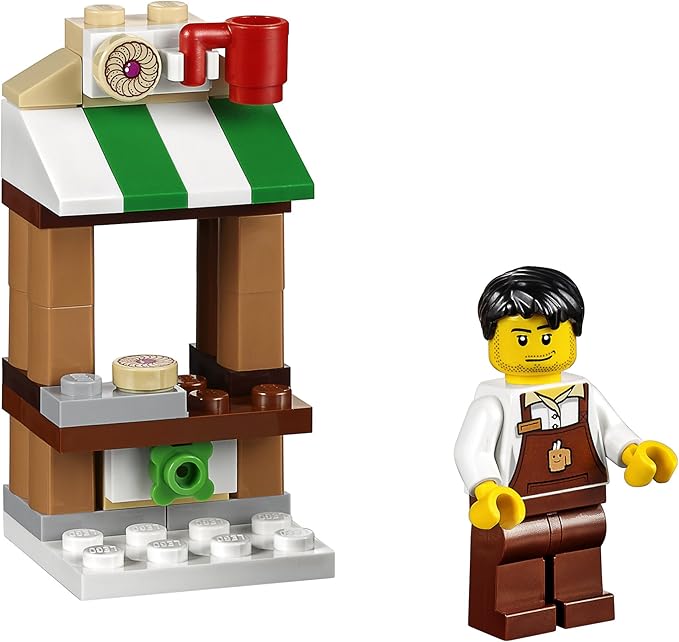 - Includes 3 minifigures: a train driver, passenger and a shopkeeper