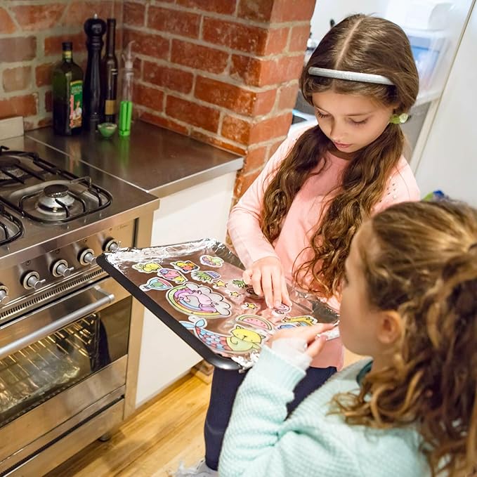 - COLOR - BAKE - SHRINK! Simply color the beautifully illustrated pre-cut designs, pop them in the oven and watch them magically shrink to 40% of their original size, in front of your eyes!