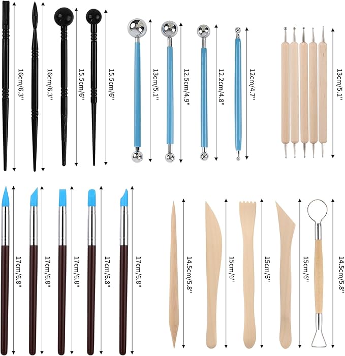 • Package includes: 5 wooden clay tools, 5 wooden handle ball stylus, 5 rubber pen, 4 rubber handle ball stylus, 4 plastic stylus, 1 pottery sponge.