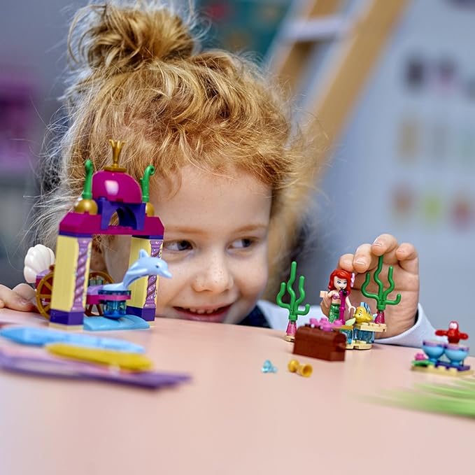 • This early-years LEGO I Disney The Little Mermaid toy building kit for kids includes an Ariel mini-doll figure and Flounder, Sebastian and dolphin LEGO figures, plus an archway, stage, treasure chest and musical instruments