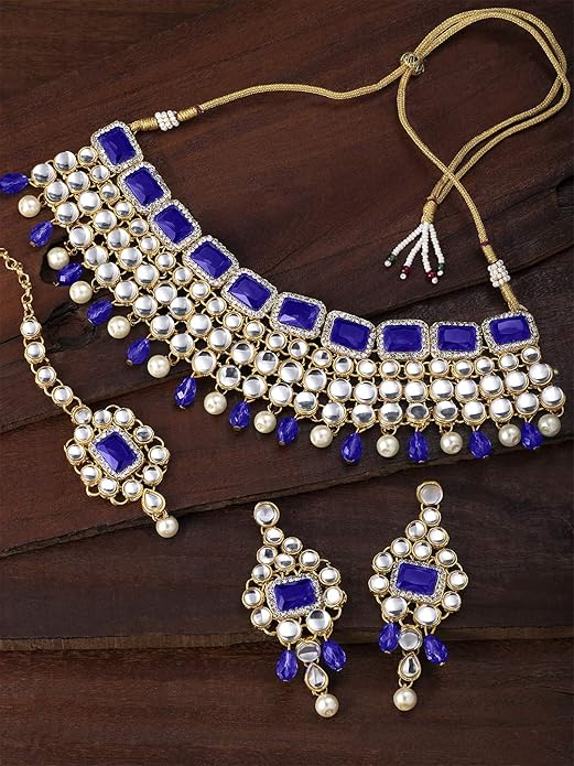 Aheli Kundan and Simulated Colored Stones Indian Ethnic Maang Tikka Necklace and Earrings Set Bollywood Festive Statement Jewelry Gift for Women