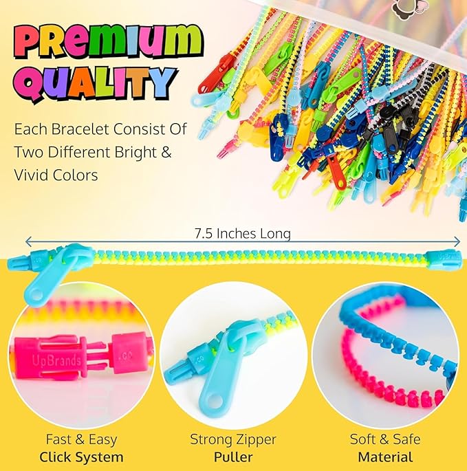 - UpBrands Fidget Zipper Bracelets Pack is selling in bulk, so they have an excellent unit price compared to similar toys sold in vending machines at rates of 1 dollar or more. Many people buy one order and enjoy the toys all year long for holidays, birthdays, and just for fun. Boys and Girls will just love these plastic bracelets.
