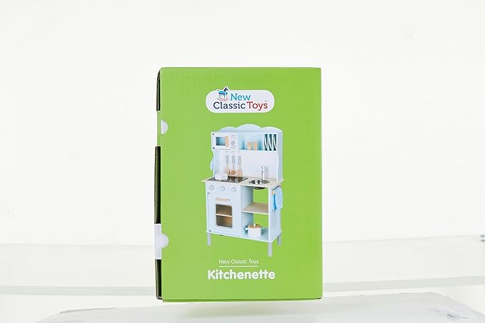 New Classic Toys Blue Wooden Pretend Play Toy Kitchen for Kids with Role Play Bon Appetit Electric Cooking Included Accesoires Makes Sound