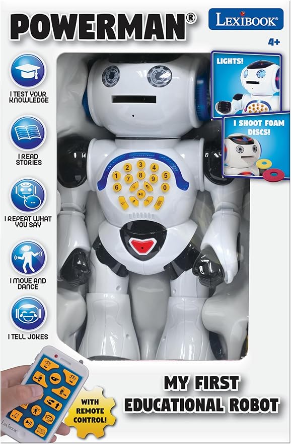 Lexibook Powerman - Remote Control Walking Talking Toy Robot, Dances, Sings, Reads Stories, Math Quiz, Shooting Discs, and Voice Mimicking, for kids 4+ - ROB50EN