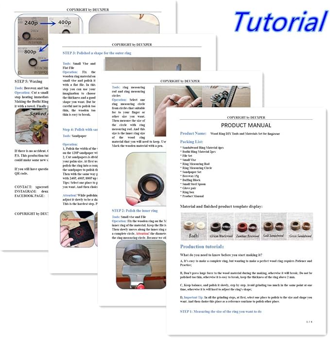 - COMPLETE KIT & EASY TO MAKE WITHOUT A MESS -This kit comes with everything you need to make Ring Artworks. 6 Wood File, Assorted Grit Sandpaper (120,240,400, 800, 2000..), Tutorial template and all crafting supplies necessary to finish ring.