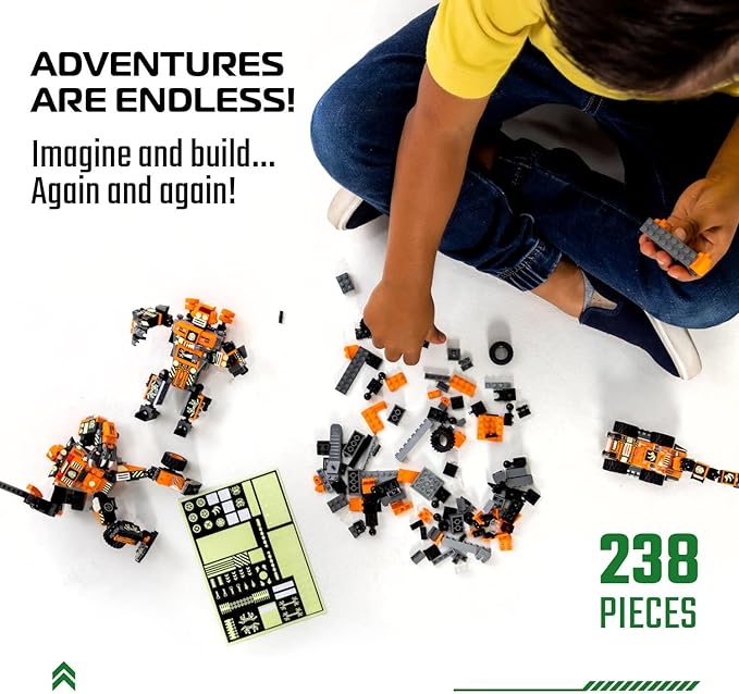 - 【Robot Building STEM Adventures】With this exciting 2023 edition, kids can build a space mech robot and change it to multiple forms for STEM storytelling. Action-packed robotics warrior figure combines to create a military superhero soldier, a cool construction car, and classic animal. Includes hot stickers that glow for best glow in the dark robot toys. Instructions for how to use interlocking bricks and brick separator for elite forces soldiers.