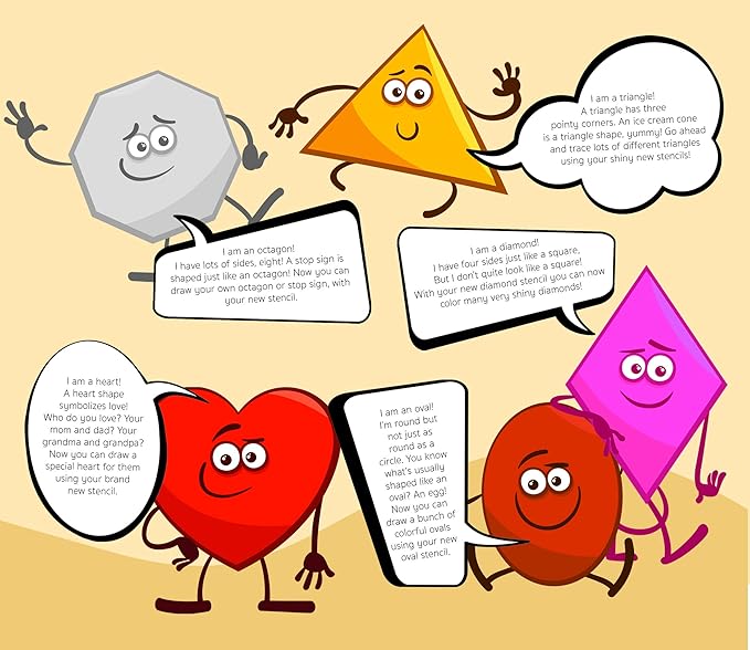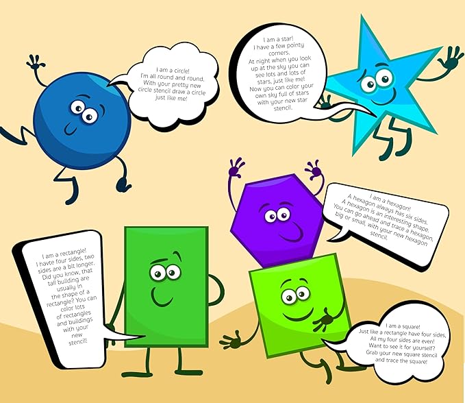 - NURTURE THEIR CREATIVITY: Unleash your cutie pie’s artistic side with this shape stencil set. Every kit comes with a rectangle, star, circle, oval, square, heart, diamond, triangle, hexagon, and octagon shaped template; 10 shapes that make for hours of fun and encourage sharing.