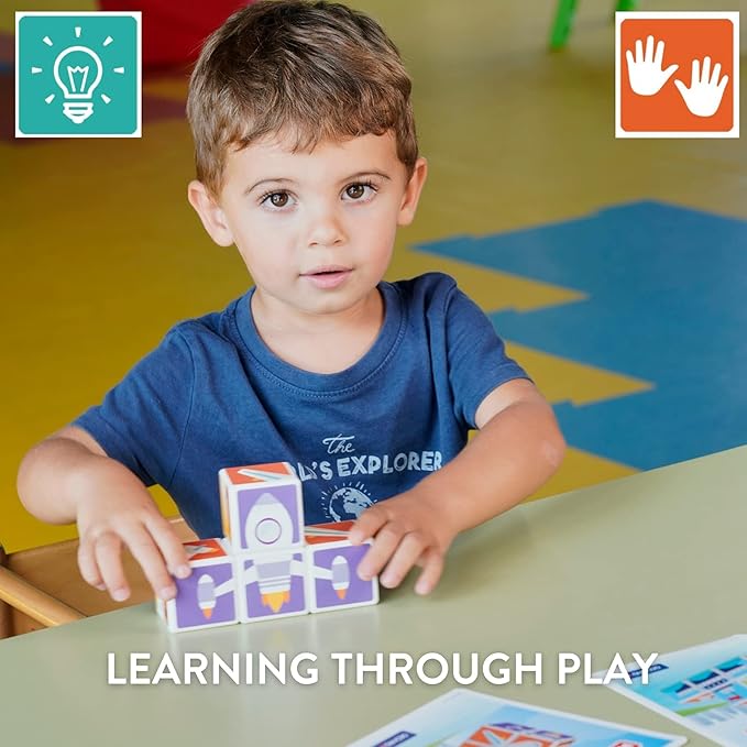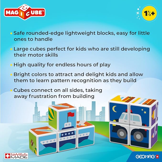 Geomag MagiCube Transport 4-Piece Magnetic Stacking Cubes Building Set, Toddlers & Kids Ages 1.5 and Up, STEM Educational Toy, Swiss-Made, Creativity, Imagination, Learning, 6 Adorable Building Ideas