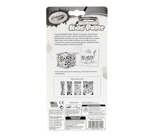 - WASHABLE KIDS PAINTS: Colors, colors, and more colors! Washable Kid's Paint is ideal for arts and crafts, posters, and school projects. The paints are easy to apply with brushes, sponges, stamps, stencils, and other tools, and they can be used on almost any surface. Easily washes clean from skin and most clothing, making mom’s job easier and worry-free.