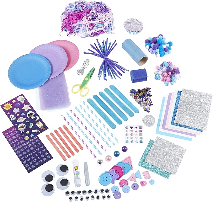 - Also includes glitter glue, crinkly paper, Paper tube, googly eyes, plates, colored paper, sequin, stickers, glue stick, and instructions