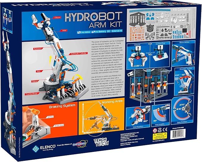 • POWERED BY WATER: Use the power of hydraulics to harness and control the Hydrobot! The arm includes 6 different axes and can rotate up to 270 degrees - no batteries required