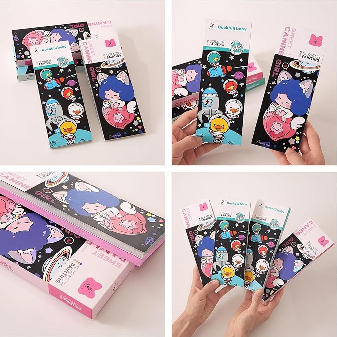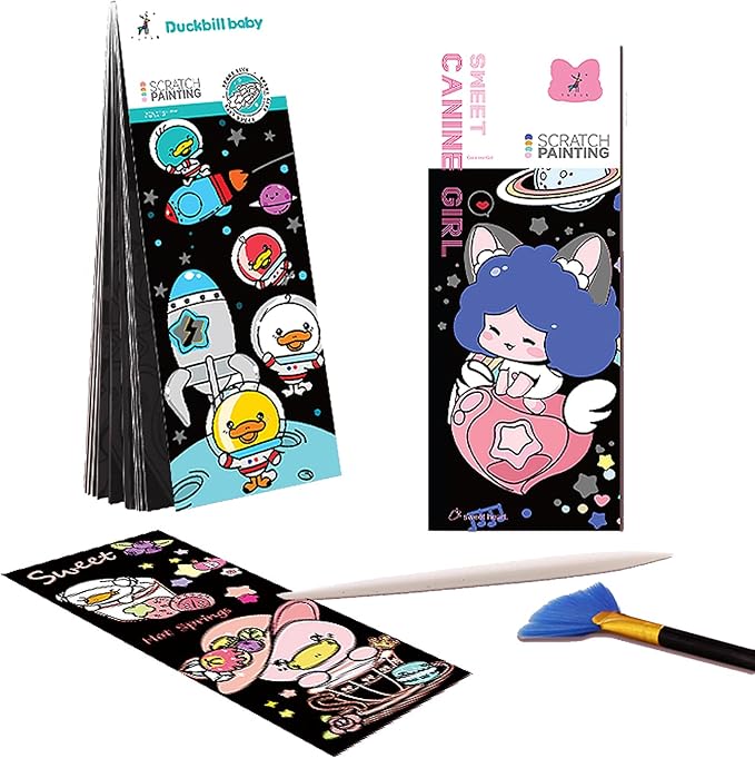 40 Card Rainbow Sparkle Scratch Painting Note, Hand-Eye Coordination Art&Crafts, Mini Magic Scratch DIY Graffiti Creative Bookmarks Gift for Kids&Adults, 8.5''x3.2'' (Canine Girl/Duckbill Baby Space)