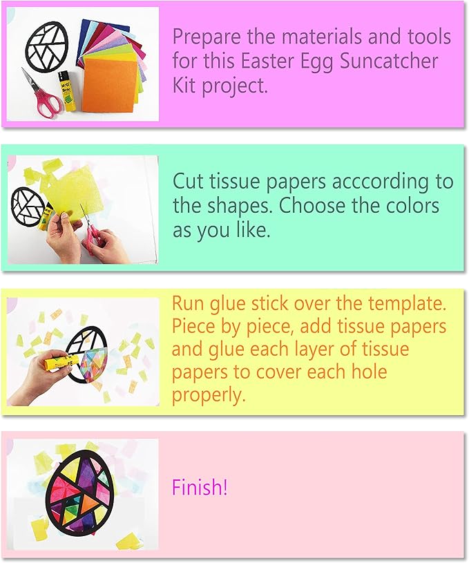 - [FEATURES] This easy and simple create your own kit contains everything needed to design and make Easter Egg themed suncatchers. With Easter Egg precut templates and plenty of colorful tissue paper, this suncatcher kit is guaranteed to brighten your day.